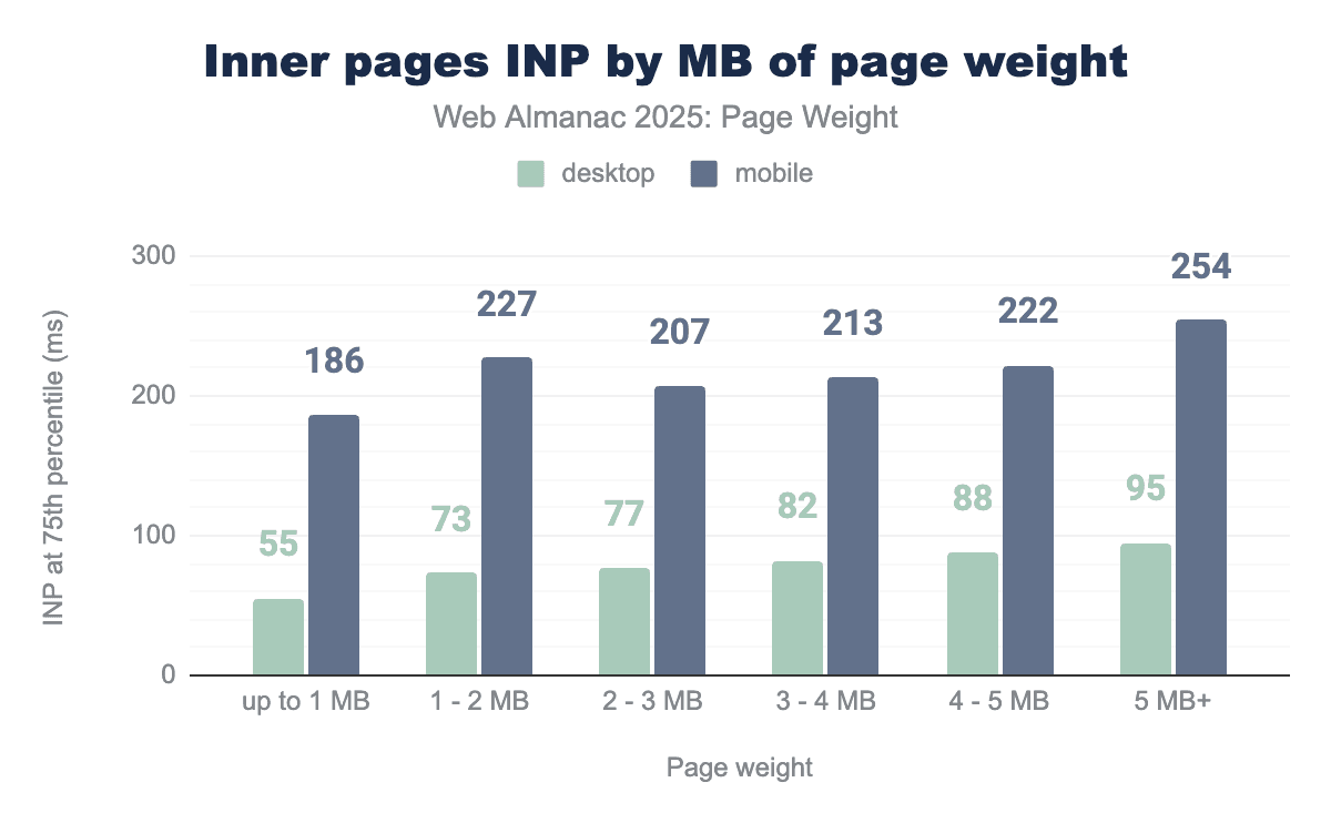 Desktop home pages consistently achieved INP times below the 200ms threshold across all weight categories even in the heaviest range, at 5 MB+, INP for the 75th percentile was just 82ms. Mobile home pages up to 3 MB achieved their INP goal. However, those in the 3-4 MB range, INP at the 75th percentile exceeded 200ms.