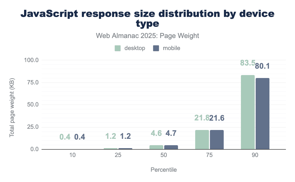 Year over year, the median home page size grew 7.8% to 2.7 MB. The median mobile home page is 2.6 MB, growing 8.4% from 2.4 MB in 2024. In 2025, the median desktop page size reached 2.9 MB, up 7.3% from 2024’s median of 2.7 MB.