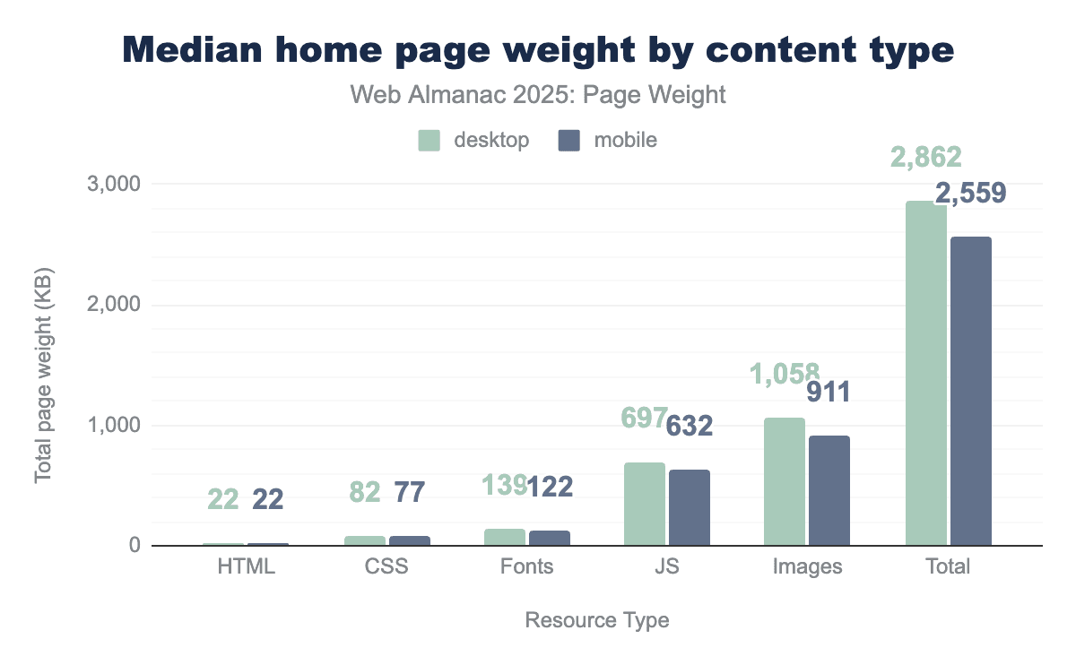 The median home page in 2025 was 2.86 MB on desktop and 2.56 MB on mobile. Images accounted for the most bytes on both mobile and desktop, followed by JavaScript and fonts.